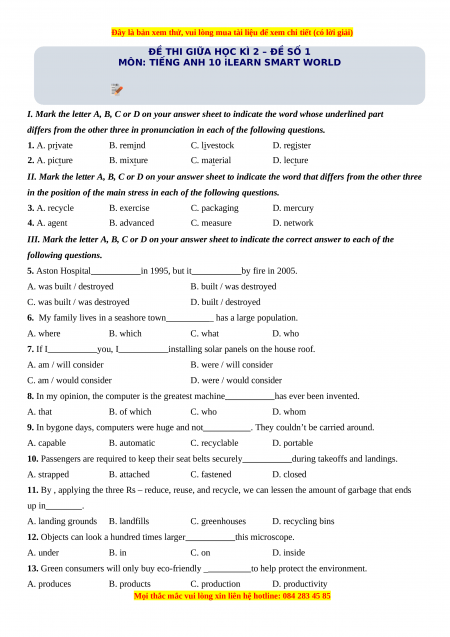 Đề thi giữa kì 2 Tiếng Anh 10 ilearn smart world (Đề 1)