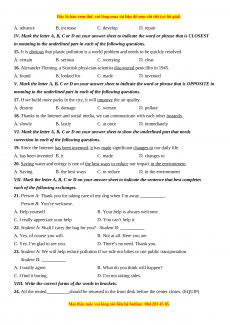 • IV. Mark the letter A, B, C or D on your answer sheet to indicate the word or phrase that is CLOSEST in meaning to the underlined part in each of the following questions.