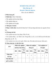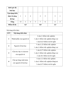 một lựa chọn đúng đúng/sai lời ngắn Vận Vận Vận Biết Hiểu Biết Hiểu Biết Hiểu dụng dụng dụng Nhận thức 11 3 2 1 1 1 hoá học Tìm hiểu thế 1 3 giới tự nhiên dưới góc độ hoá học Vận dụng kiến thức kĩ năng 1 1 4 2 5 3 1 đã học Tổng 13 1 4 3 7 6 4 2 Điểm tối đa 4,5 4,0 1,5 Nội dung kiến thức: STT