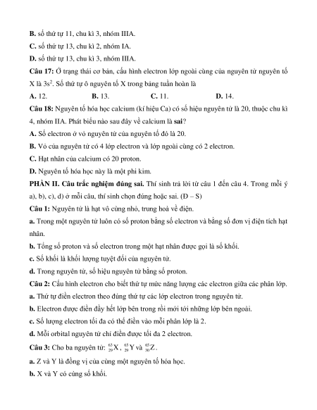 1 câu (1 điểm) trắc nghiệm đúng/ sai của nguyên tử