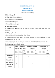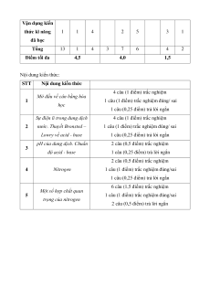 một lựa chọn đúng đúng/sai lời ngắn Vận Vận Vận Biết Hiểu Biết Hiểu Biết Hiểu dụng dụng dụng Nhận thức 11 3 2 1 1 1 hoá học Tìm hiểu thế giới tự nhiên 1 3 dưới góc độ hoá học Vận dụng kiến thức kĩ năng 1 1 4 2 5 3 1 đã học Tổng 13 1 4 3 7 6 4 2 Điểm tối đa 4,5 4,0 1,5 Nội dung kiến thức: STT