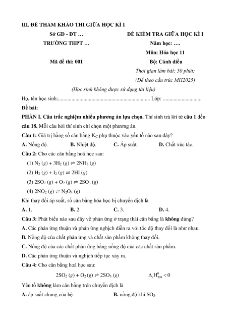 ĐỀ KIỂM TRA GIỮA HỌC KÌ I TRƯỜNG THPT … Năm học: …. Môn: Hóa học 11 Mã đề thi: 001 Bộ: Cánh diều