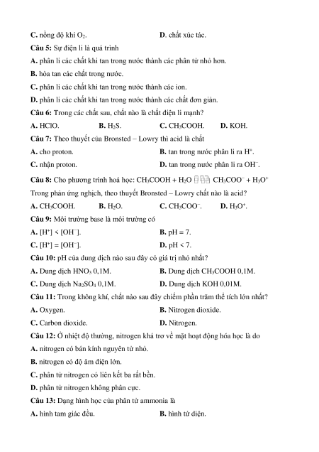 Câu 1: Giá trị hằng số cân bằng KC phụ thuộc vào yếu tố nào sau đây? A. Nồng độ. B. Nhiệt độ. C. Áp suất. D. Chất xúc tác.