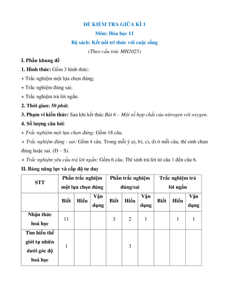 => Tham khảo thêm: Bộ 11 đề thi giữa kì 1 Hóa Học 11 Kết nối tri thức cấu trúc mới có tự luận