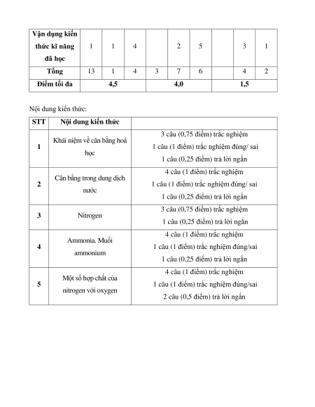 một lựa chọn đúng đúng/sai lời ngắn Vận Vận Vận Biết Hiểu Biết Hiểu Biết Hiểu dụng dụng dụng Nhận thức 11 3 2 1 1 1 hoá học Tìm hiểu thế giới tự nhiên 1 3 dưới góc độ hoá học Vận dụng kiến thức kĩ năng 1 1 4 2 5 3 1 đã học Tổng 13 1 4 3 7 6 4 2 Điểm tối đa 4,5 4,0 1,5 Nội dung kiến thức: STT