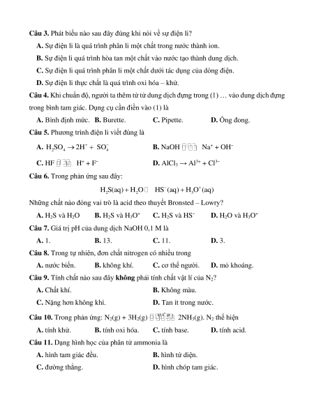 Câu 3. Phát biểu nào sau đây đúng khi nói về sự điện li?