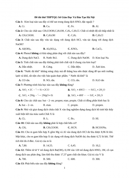 Đề thi thử THPTQG Sở Giáo Dục Và Đào Tạo Hà Nội