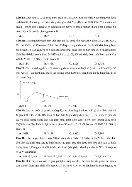 Câu 29: Cho từ từ dung dịch HCl vào dung dịch chứa a mol Ba(AlO2)2 và b mol Ba(OH)2. Số
