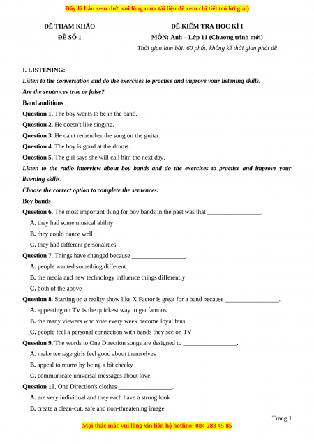 Thời gian làm bài: 60 phút; không kể thời gian phát đề I. LISTENING: