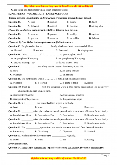 Question 24. Roles (A) in homemaking (B) and breadwinning can share (C) by family members (D). Trang 2