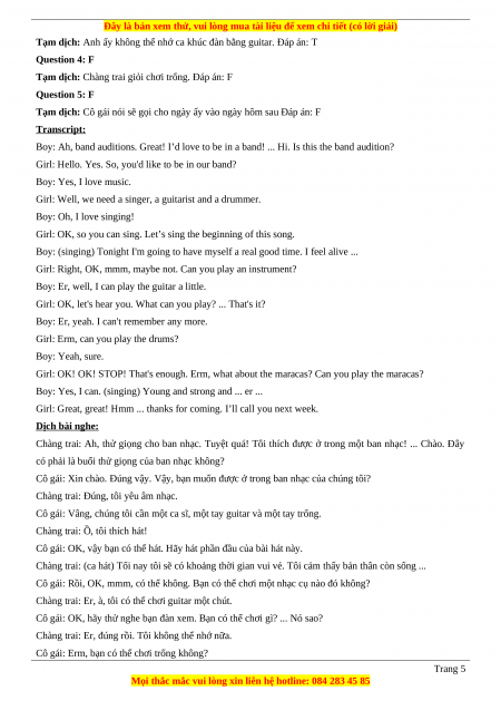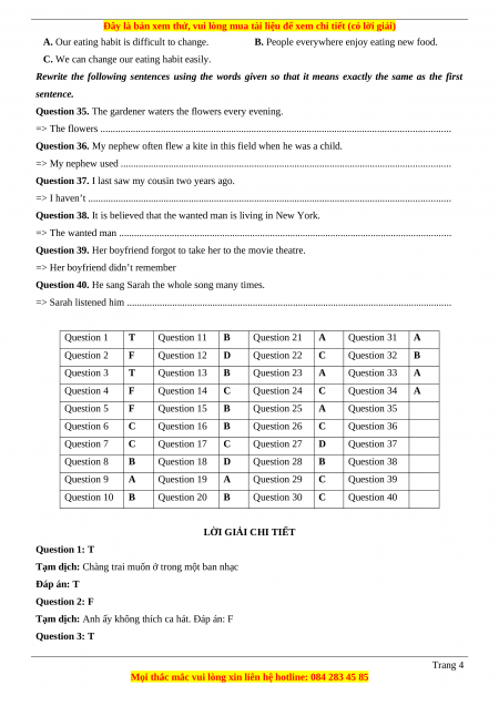 => Sarah listened him ................................................................................................................................. Question 1 T Question 11 B Question 21 A Question 31 A Question 2 F Question 12 D Question 22 C Question 32 B Question 3 T Question 13 B Question 23 A Question 33 A Question 4 F Question 14 C Question 24 C Question 34 A Question 5 F Question 15 B Question 25 A Question 35 Question 6 C Question 16 B Question 26 C Question 36 Question 7 C Question 17 C Question 27 D Question 37 Question 8 B Question 18 D Question 28 B Question 38 Question 9 A Question 19 A Question 29 C Question 39 Question 10 B Question 20 B Question 30 C Question 40 LỜI GIẢI CHI TIẾT Question 1: T