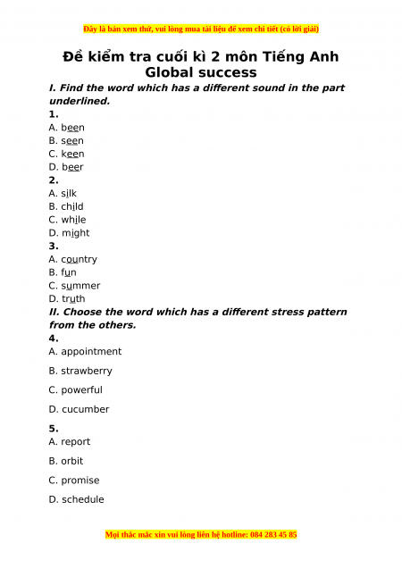 I. Find the word which has a different sound in the part underlined. 1. A. been B. seen C. keen D. beer 2. A. silk B. child C. while D. might 3. A. country B. fun C. summer D. truth