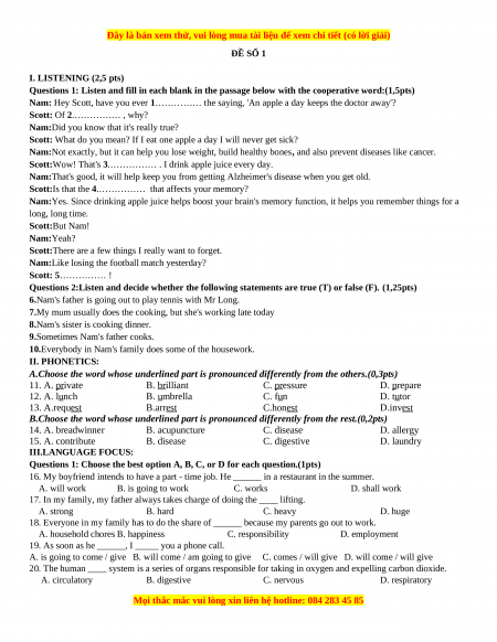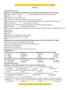 ĐỀ SỐ 1 I. LISTENING (2,5 pts)