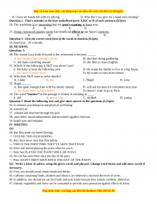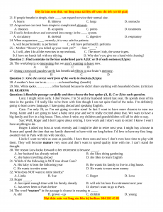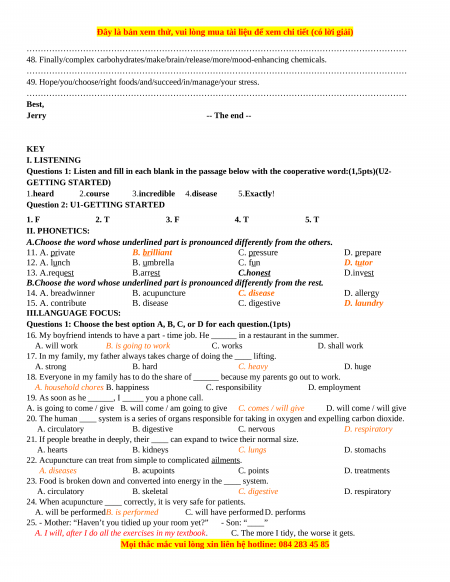 B.Choose the word whose underlined part is pronounced differently from the rest.(0,2pts) 14. A. breadwinner B. acupuncture C. disease D. allergy 15. A. contribute B. disease C. digestive D. laundry III.LANGUAGE FOCUS: