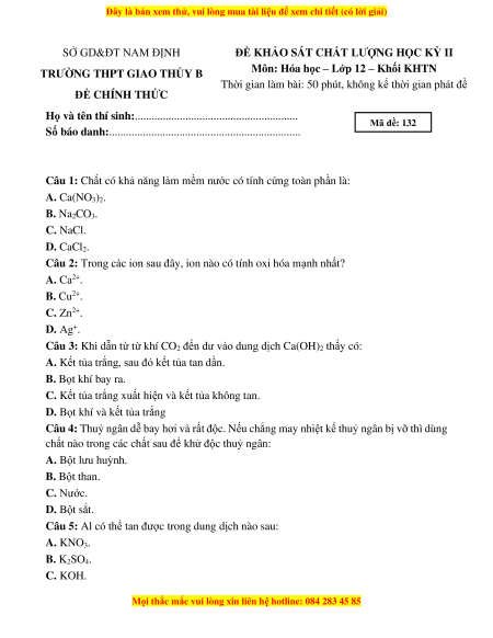 Môn: Hóa học – Lớp 12 – Khối KHTN NG THPT GIAO THỦY B