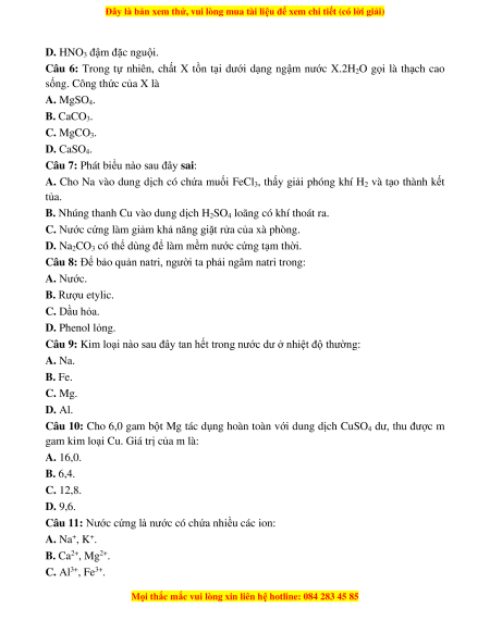 Câu 11: Nước cứng là nước có chứa nhiều các ion: A. Na+, K+. B. Ca2+, Mg2+. C. Al3+, Fe3+.
