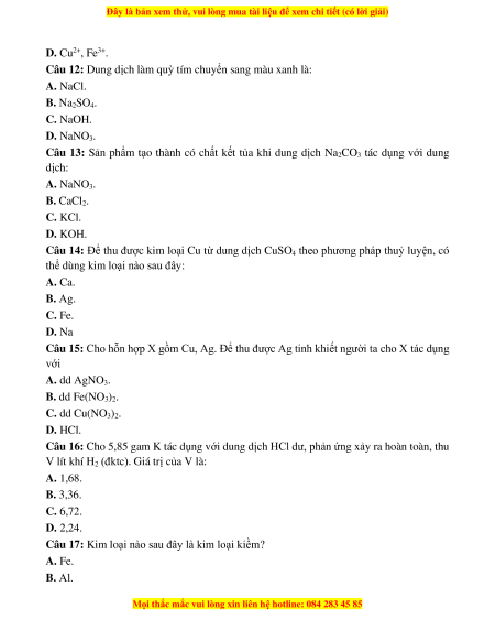 Câu 12: Dung dịch làm quỳ tím chuyển sang màu xanh là: A. NaCl. B. Na2SO4. C. NaOH. D. NaNO3.