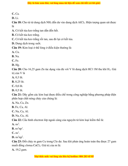 Câu 19: Kim loại ở thể lỏng ở điều kiện thường là: A. Cu. B. Na. C. Fe. D. Hg.