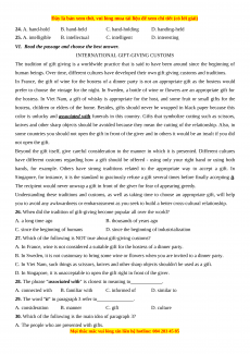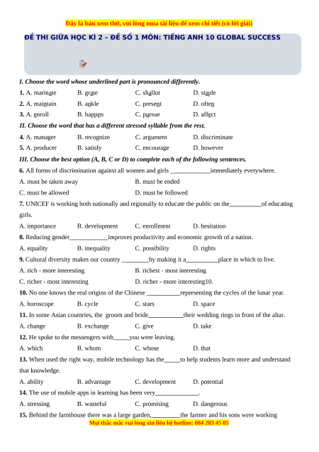 ĐỀ THI GIỮA HỌC KÌ 2 – ĐỀ SỐ 1 MÔN: TIẾNG ANH 10 GLOBAL SUCCESS