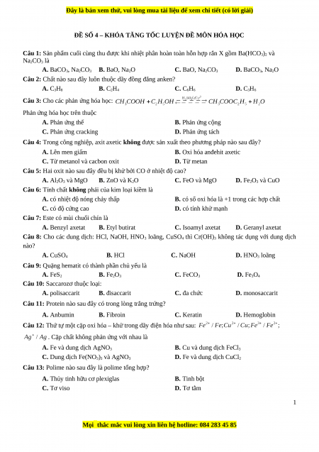 ĐỀ SỐ 4 – KHÓA TĂNG TỐC LUYỆN ĐỀ MÔN HÓA HỌC