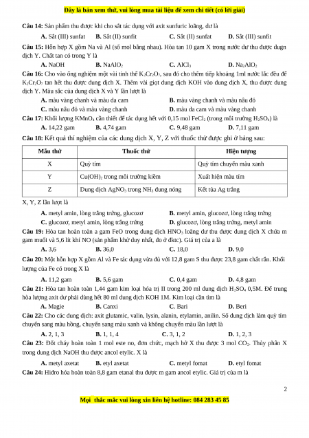 Câu 18: Kết quả thí nghiệm của các dung dịch X, Y, Z với thuốc thử được ghi ở bảng sau: Mẫu thử Thuốc thử Hiện tượng X Quỳ tím Quỳ tím chuyển màu xanh Y