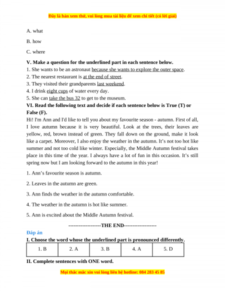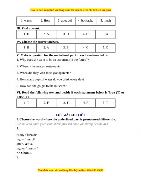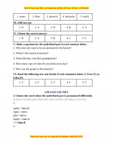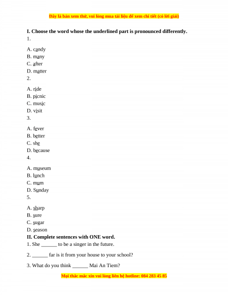 I. Choose the word whose the underlined part is pronounced differently. 1. A. candy B. many C. after D. matter 2. A. ride B. picnic C. music D. visit 3. A. fever B. better C. she D. because 4. A. museum B. lunch C. mum D. Sunday 5. A. sharp B. sure C. sugar D. season