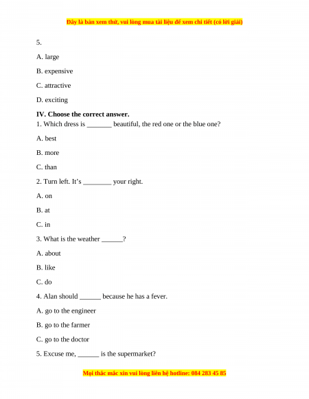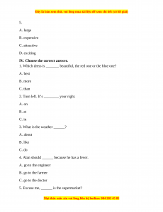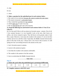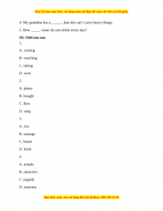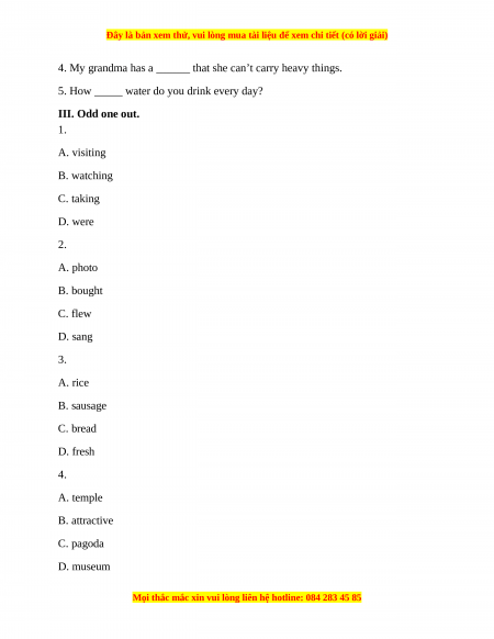 5. How _____ water do you drink every day? III. Odd one out. 1. A. visiting B. watching C. taking D. were 2. A. photo B. bought C. flew D. sang 3. A. rice B. sausage C. bread D. fresh 4. A. temple B. attractive C. pagoda D. museum