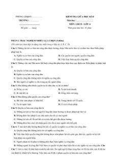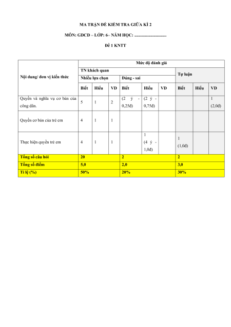 Nội dung/ đơn vị kiến thức Tự luận Nhiều lựa chọn Đúng - sai Biết Hiểu VD Biết Hiểu VD Biết Hiểu VD Quyên va nghia vu cơ ban cua (2 ý - (2 ý - 1 5 1 2 công dân. 0,25đ) 0,75đ) (2,0đ) Quyên cơ ban cua tre em 4 1 1 1 1 Thưc hiên quyên tre em 4 1 1 (4 ý - (1,0đ) 1,0đ) Tổng số câu hỏi 20 2 2 Tổng số điểm 5,0 2,0 3,0 Tỉ lệ (%) 50% 20% 30%