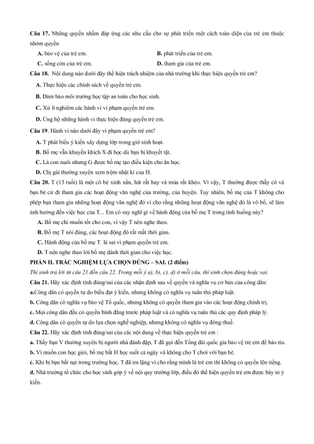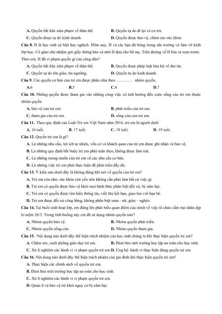 Câu 17. Những quyên nhằm đáp ứng các nhu cầu cho sư phát triển một cách toan diên cua tre em thuộc nhóm quyên A. bao vê cua tre em.