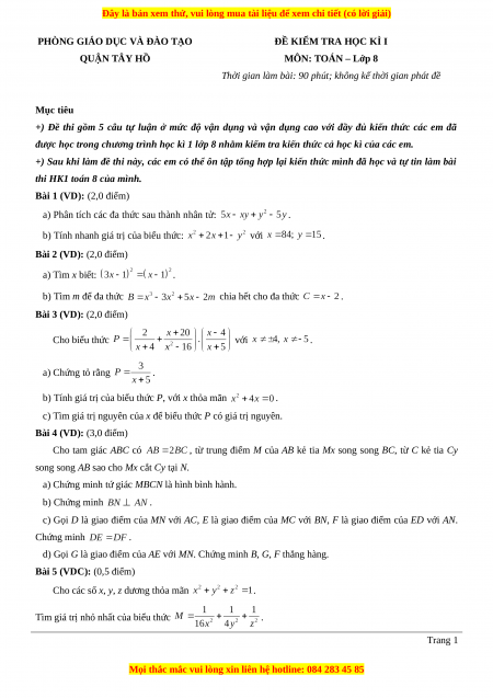 ĐỀ KIỂM TRA HỌC KÌ I QUẬN TÂY HỒ MÔN: TOÁN – Lớp 8