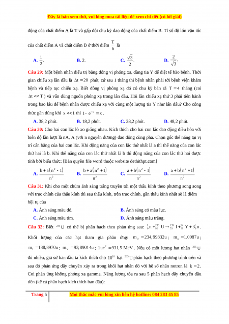 Câu 29: Một bệnh nhân điểu trị bằng đổng vị phóng xạ, dùng tia Y để diệt tế bào bệnh. Thời