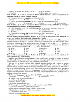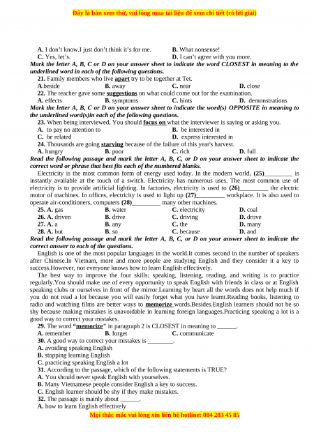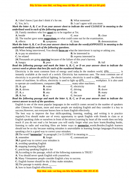 21. Family members who live apart try to be together at Tet. A.beside B. away C. near D. close