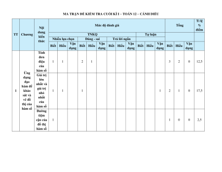 MA TRẬN ĐỀ KIỂM TRA CUỐI KÌ I – TOÁN 12 – CÁNH DIỀU Tỉ lệ