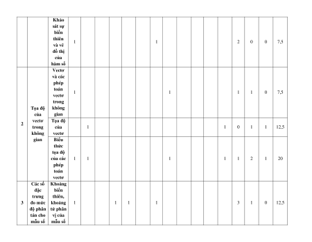 Mức độ đánh giá Tổng % Nội điểm dung TT Chương TNKQ Tự luận kiến Nhiều lựa chọn Đúng - sai Trả lời ngắn thức Vận Vận Vận Vận Vận Biết Hiểu Biết Hiểu Biết Hiểu Biết Hiểu Biết Hiểu dụng dụng dụng dụng dụng Tính đơn điệu 1 1 2 1 3 2 0 12,5 của hàm số Ứng Giá trị dụng lớn đạo nhất và hàm để giá trị 1 khảo 1 1 1 1 2 1 0 17,5 nhỏ sát và nhất vẽ đồ của thị của hàm số hàm số Đường tiệm cận của 1 1 0 0 2,5 đồ thị hàm số Khảo sát sự biến thiên 1 1 2 0 0 7,5 và vẽ đồ thị của hàm số Vectơ và các phép toán 1 1 1 1 0 7,5 vectơ trong Tọa độ không của gian vectơ Tọa độ 2 trong của 1 1 0 1 1 12,5 không vectơ gian Biểu thức tọa độ của các 1 1 1 1 1 2 1 20 phép toán vectơ Các số Khoảng đặc biến trưng thiên, 3 đo mức khoảng 1 1 1 1 3 1 0 12,5 độ phân tứ phân tán cho vị của mẫu số mẫu số liệu liệu ghép ghép nhóm nhóm Phương sai, độ lệch chuẩn của 1 2 1 2 0 7,5 mẫu số liệu ghép nhóm Tổng số câu 8 4 0 4 4 0 2 2 0 0 0 3 14 10 3 Tổng số điểm 3,0 2,0 2,0 3,0 4,0 3,0 3,0 10 Tỉ lệ % 30 20 20 30 40 30 30 100 Lưu ý: