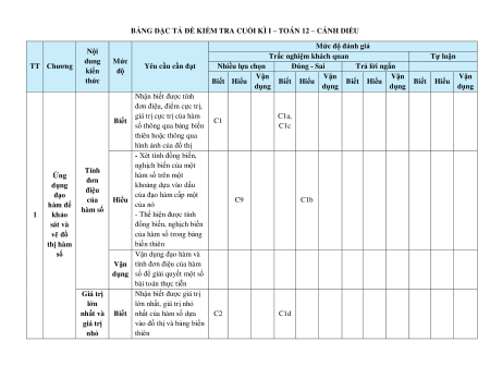 BẢNG ĐẶC TẢ ĐỀ KIỂM TRA CUỐI KÌ I – TOÁN 12 – CÁNH DIỀU