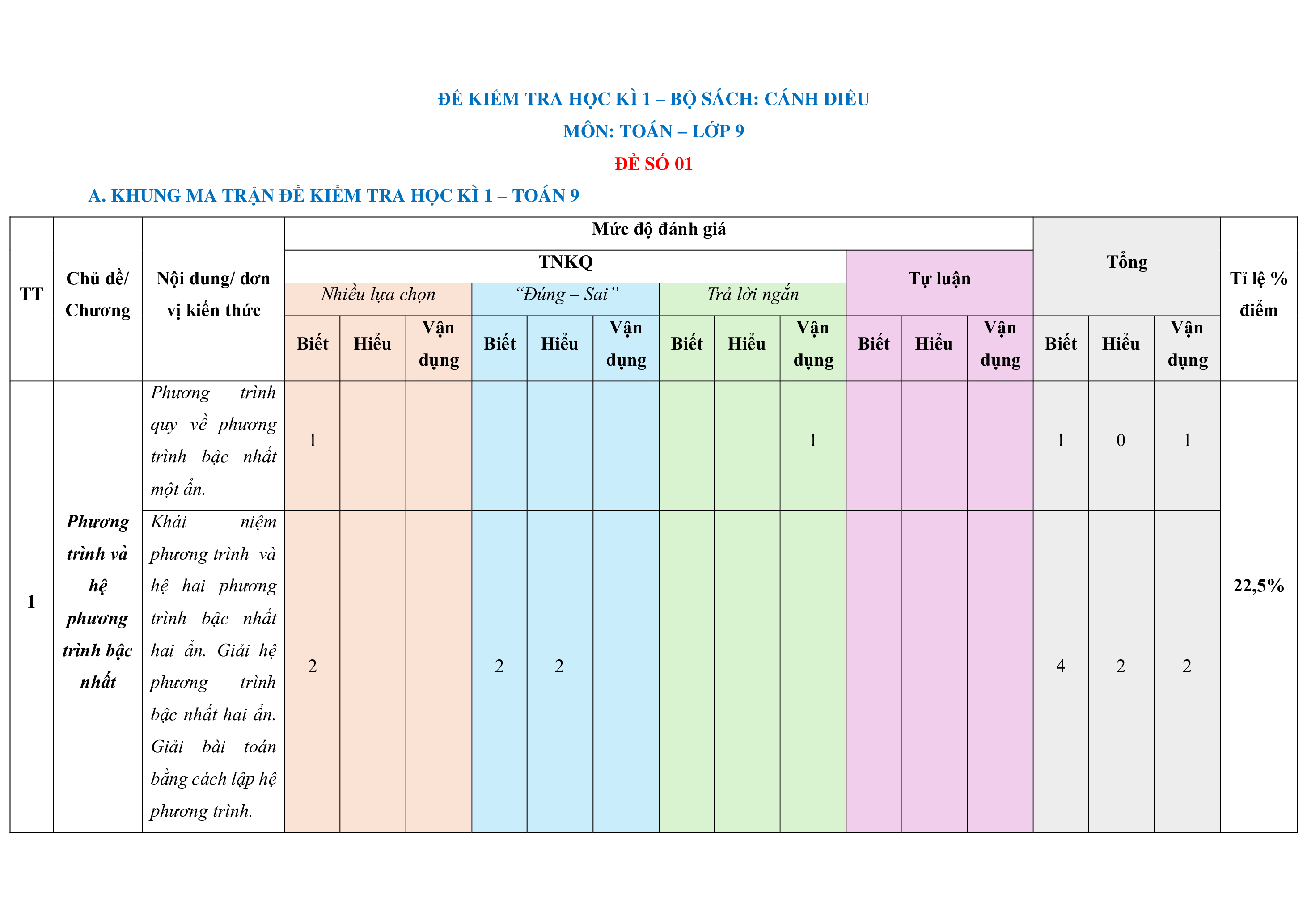 A. KHUNG MA TRẬN ĐỀ KIỂM TRA HỌC KÌ 1 – TOÁN 9