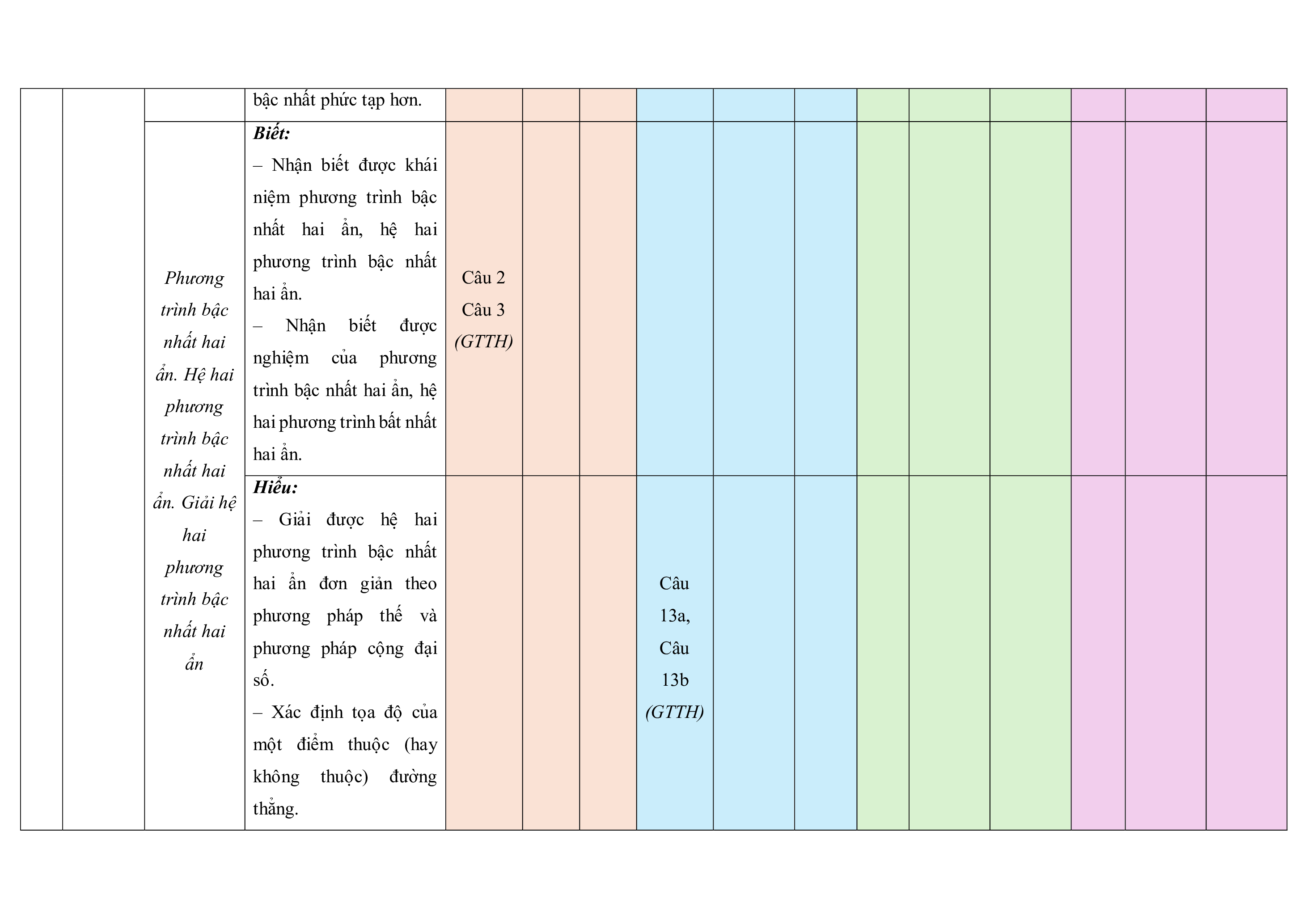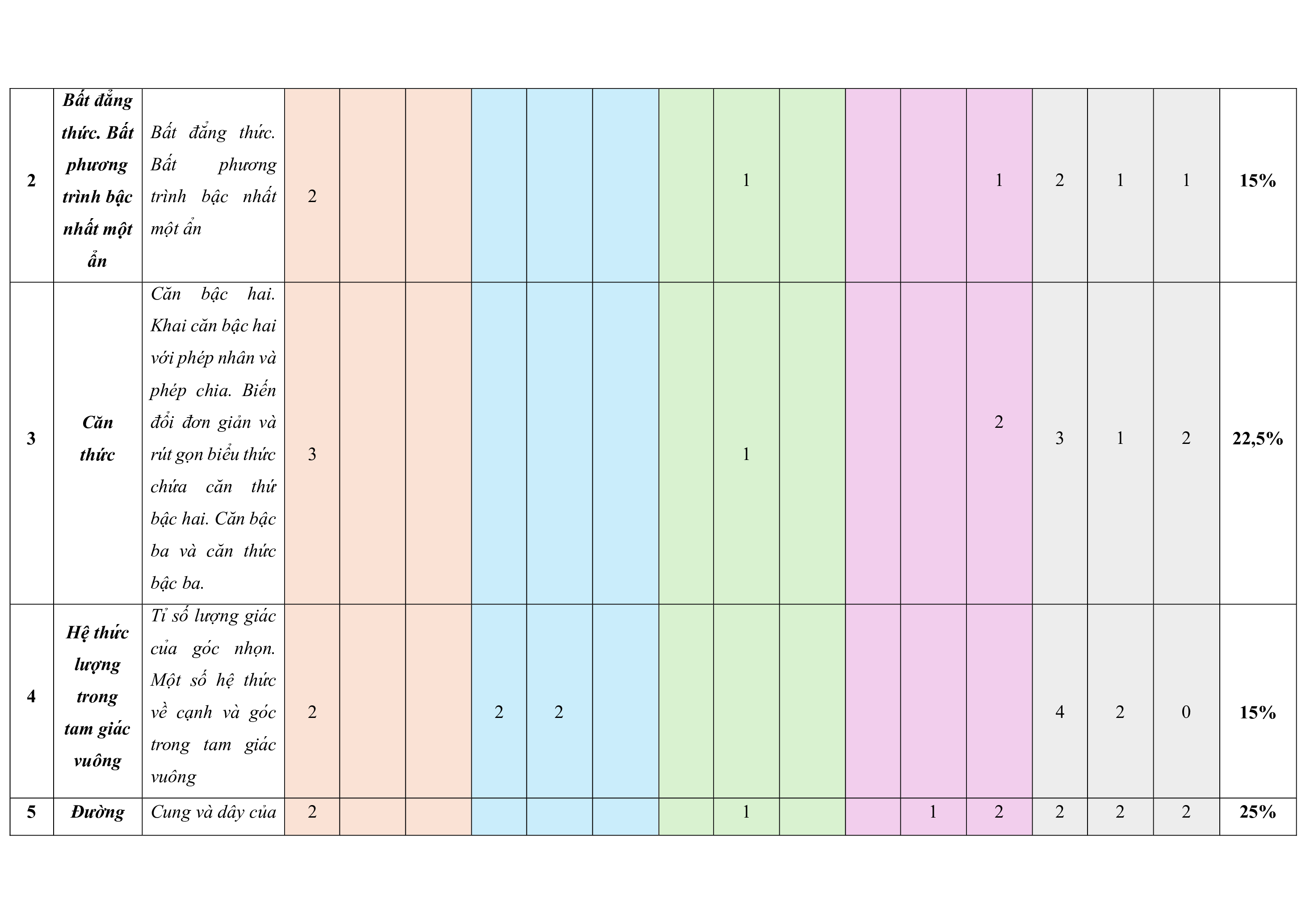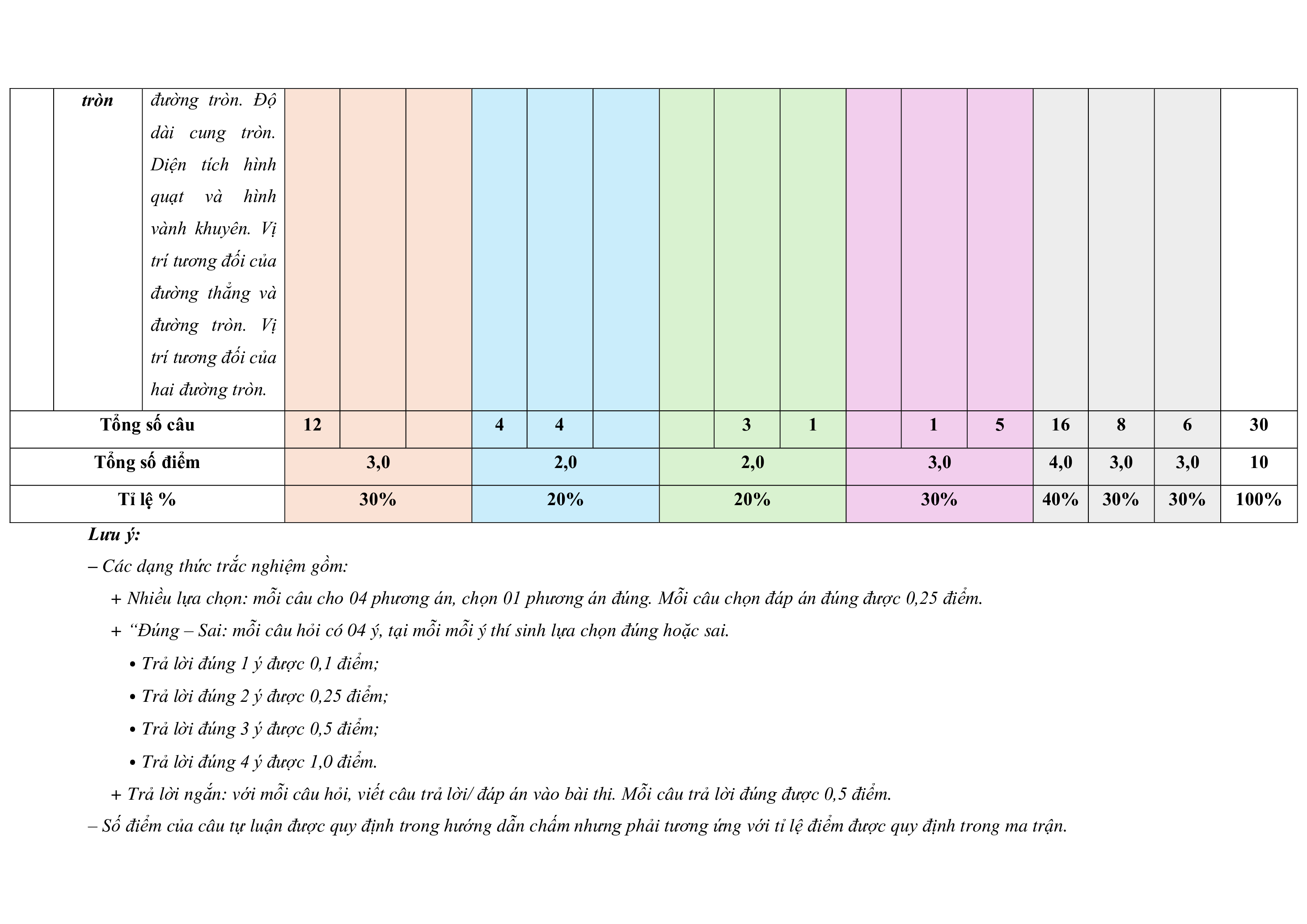 trí tương đối của hai đường tròn. Tổng số câu 12 4 4 3 1 1 5 16 8 6 30 Tổng số điểm 3,0 2,0 2,0 3,0 4,0 3,0 3,0 10 Tỉ lệ % 30% 20% 20% 30% 40% 30% 30% 100% Lưu ý: