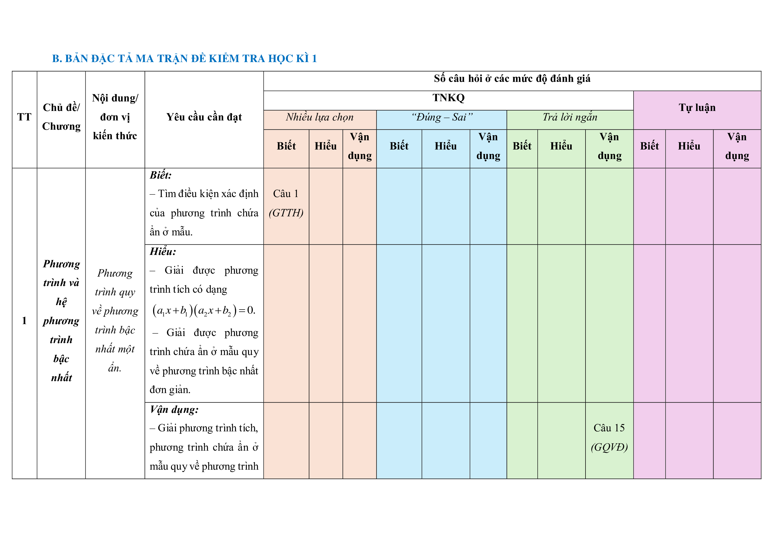 B. BẢN ĐẶC TẢ MA TRẬN ĐỀ KIỂM TRA HỌC KÌ 1