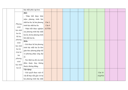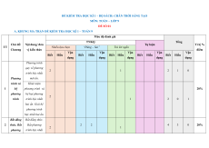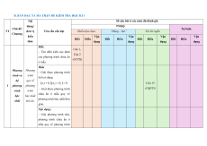 Mức độ đánh giá TNKQ Tổng Chủ đề/ Nội dung/ đơn Tự luận Tỉ lệ % TT Nhiều lựa chọn “Đúng – Sai” Trả lời ngắn Chương vị kiến thức điểm Vận Vận Vận Vận Vận Biết Hiểu Biết Hiểu Biết Hiểu Biết Hiểu Biết Hiểu dụng dụng dụng dụng dụng Phương trình quy về phương 2 1 2 1 0 trình bậc nhất Phương một ẩn. trình và Khái niệm 1 hê ̣ phương trình và 20% phương hệ hai phương 2 trình trình bậc nhất 1 2 0 1 hai ẩn. Giải hệ phương trình bậc nhất hai ẩn. Bất đẳng