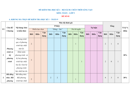 A. KHUNG MA TRẬN ĐỀ KIỂM TRA HỌC KÌ 1 – TOÁN 9