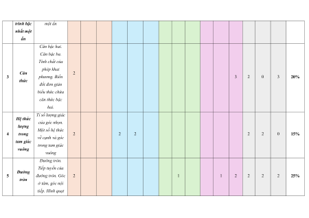 về cạnh và góc tam giác trong tam giác vuông vuông Đường tròn. Tiếp tuyến của Đường 5 đường tròn. Góc 2 1 1 2 2 2 2 25% tròn ở tâm, góc nội tiếp. Hình quạt tròn và hình vành khuyên. Tổng số câu 12 4 4 3 1 1 5 16 8 6 30 Tổng số điểm 3,0 2,0 2,0 3,0 4,0 3,0 3,0 10 Tỉ lệ % 30% 20% 20% 30% 40 30 30 100% Lưu ý: