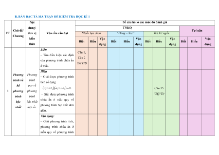 B. BẢN ĐẶC TẢ MA TRẬN ĐỀ KIỂM TRA HỌC KÌ 1 Nội