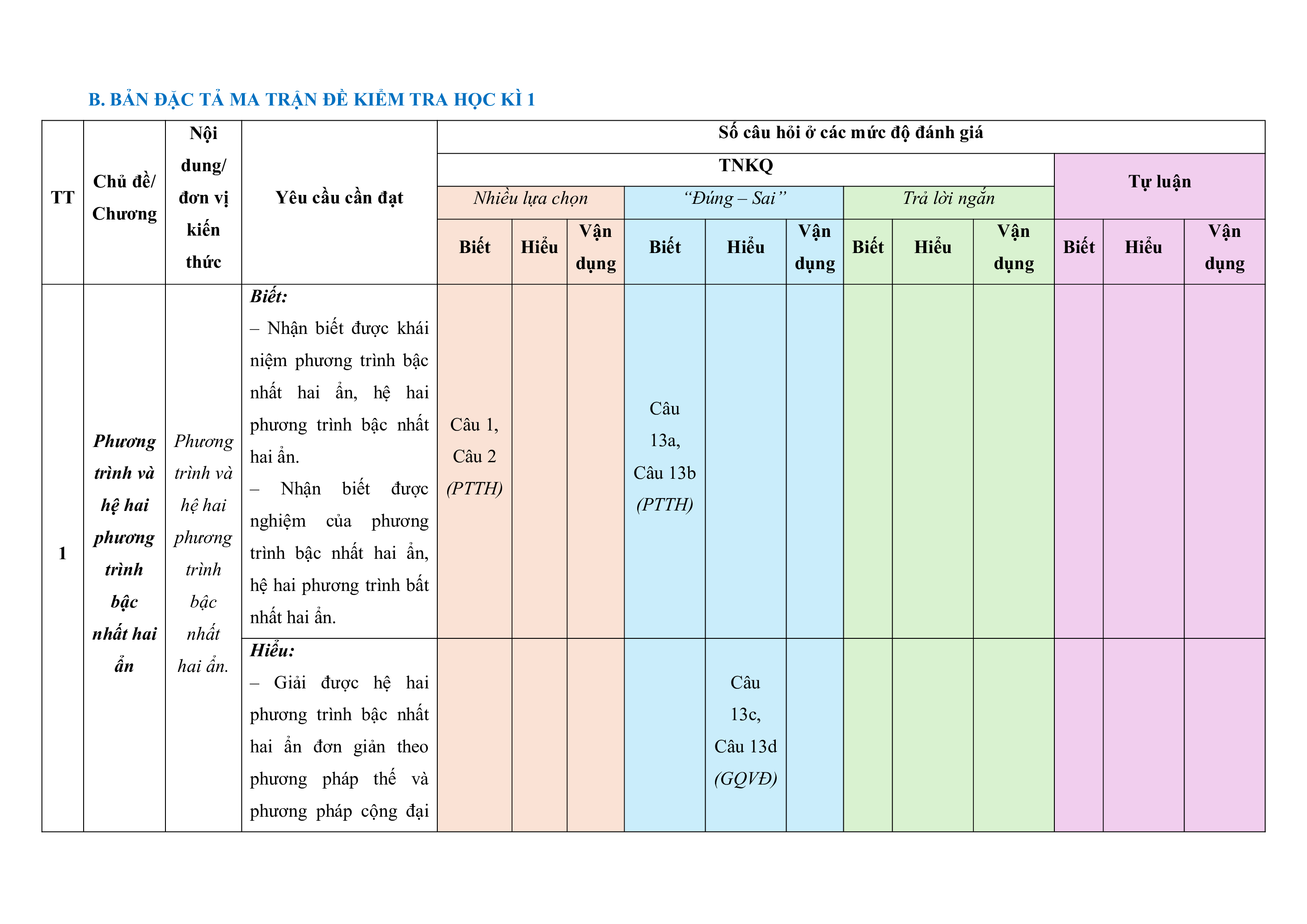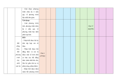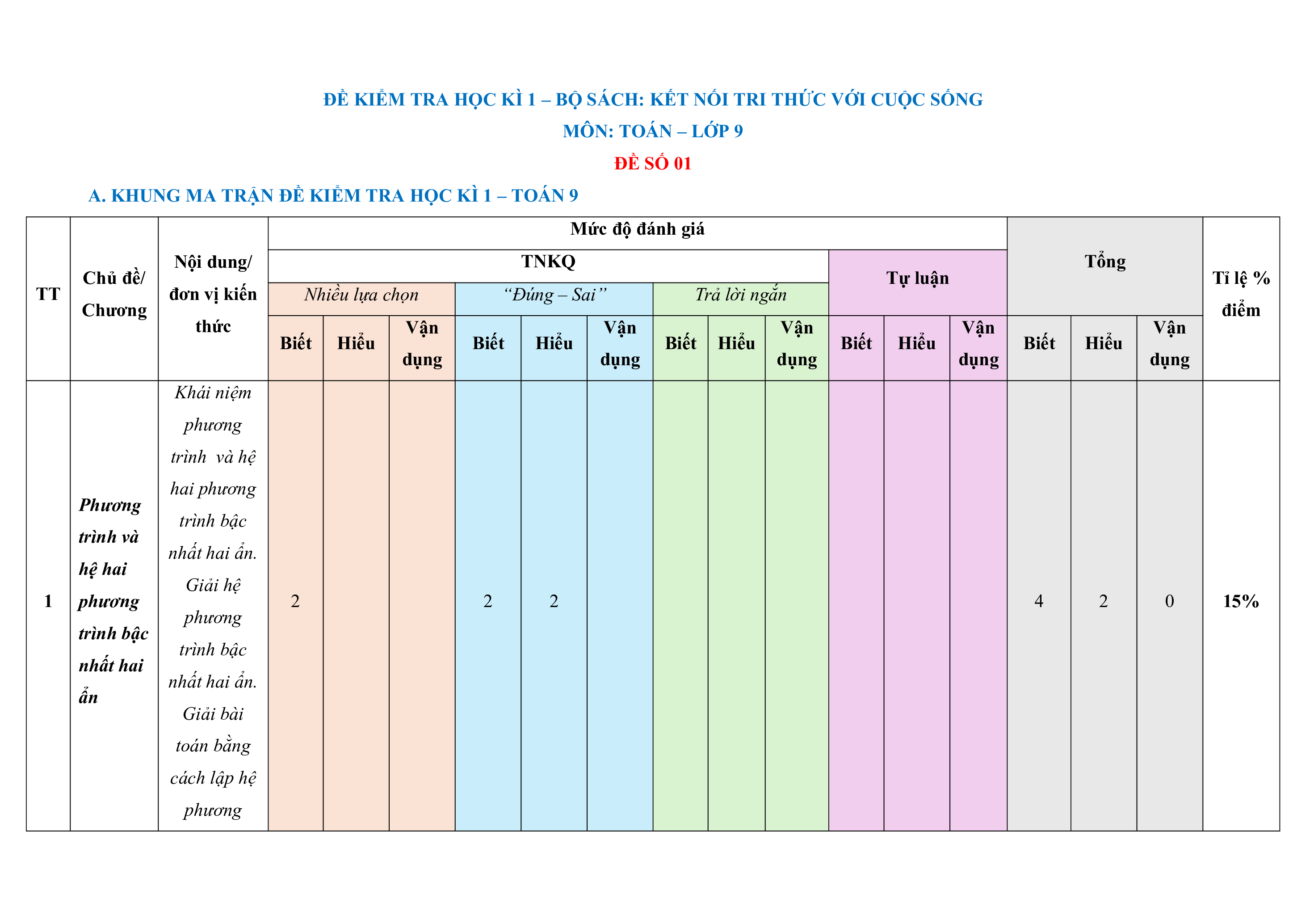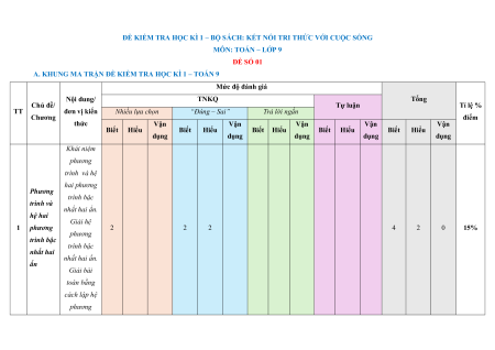 A. KHUNG MA TRẬN ĐỀ KIỂM TRA HỌC KÌ 1 – TOÁN 9 Mức độ đánh giá Nội dung/ TNKQ Tổng Chủ đề/ Tự luận Tỉ lệ % TT đơn vị kiến Nhiều lựa chọn “Đúng – Sai” Trả lời ngắn Chương điểm thức Vận Vận Vận Vận Vận Biết Hiểu Biết Hiểu Biết Hiểu Biết Hiểu Biết Hiểu dụng dụng dụng dụng dụng Khái niệm phương trình và hệ hai phương Phương trình bậc trinh va nhất hai ẩn. hê hai Giải hệ 1 phương 2 2 2 4 2 0 15% phương trinh bâc trình bậc nhât hai nhất hai ẩn. ân Giải bài toán bằng cách lập hệ phương trình. Phương trình quy về Phương 1 phương 1 1 0 1 trinh va trình bậc bât nhất môt ẩn 2 phương 20% Bất đăng trinh bâc thưc. Bất nhât môt 1 phương 1 1 1 1 1 ân trình bậc nhất môt ẩn Căn bậc hai. Khai căn bậc hai với phép Căn bâc nhân và hai va phép chia. 3 2 3 1 2 22,5% căn bâc Biến đổi 3 1 ba đơn giản và rút gọn biểu thưc chưa căn thư bậc hai. Căn bậc ba và căn thưc bậc ba. Ti sô lương giác cua Hê thưc goc nhọn. lương Môt sô hệ 4 trong 2 2 2 4 2 0 15% thưc về