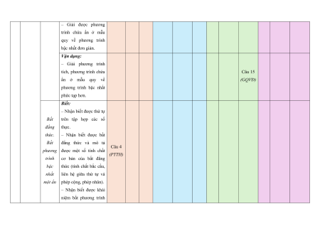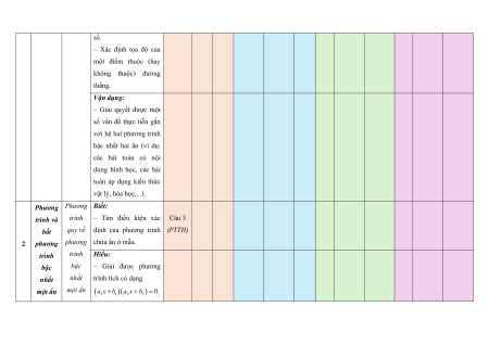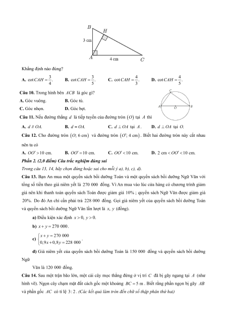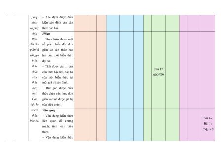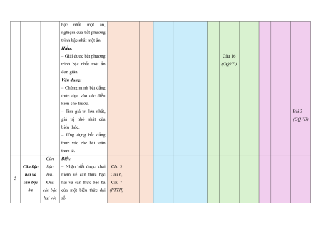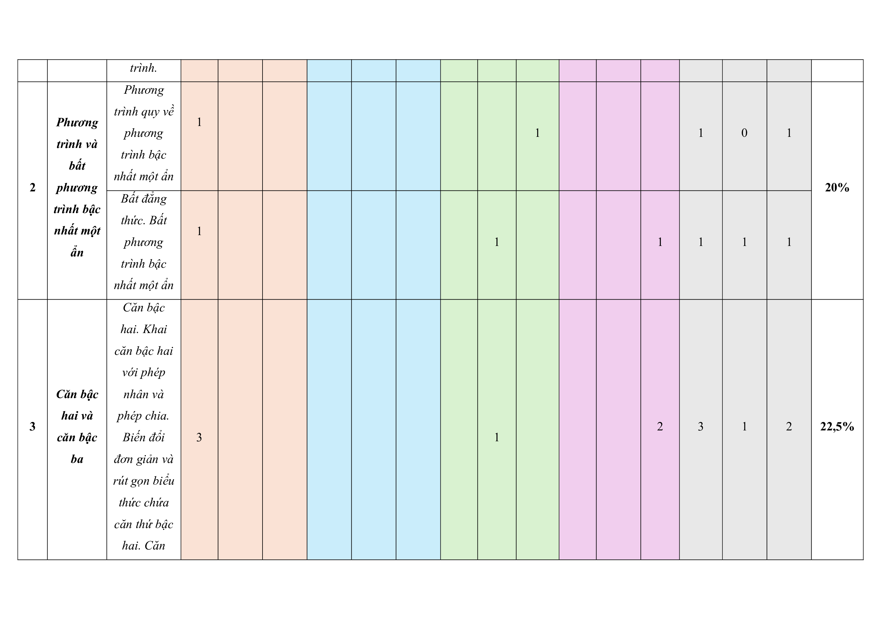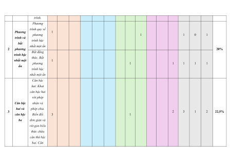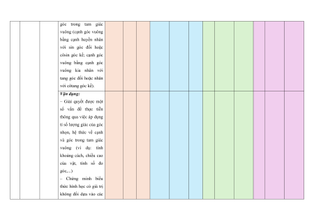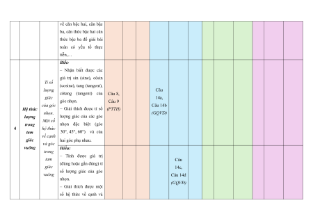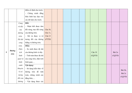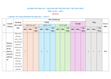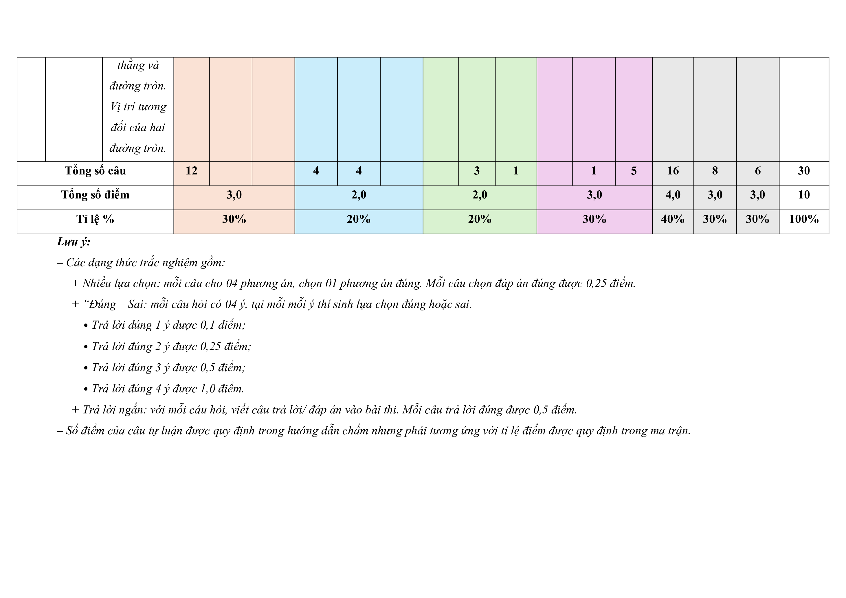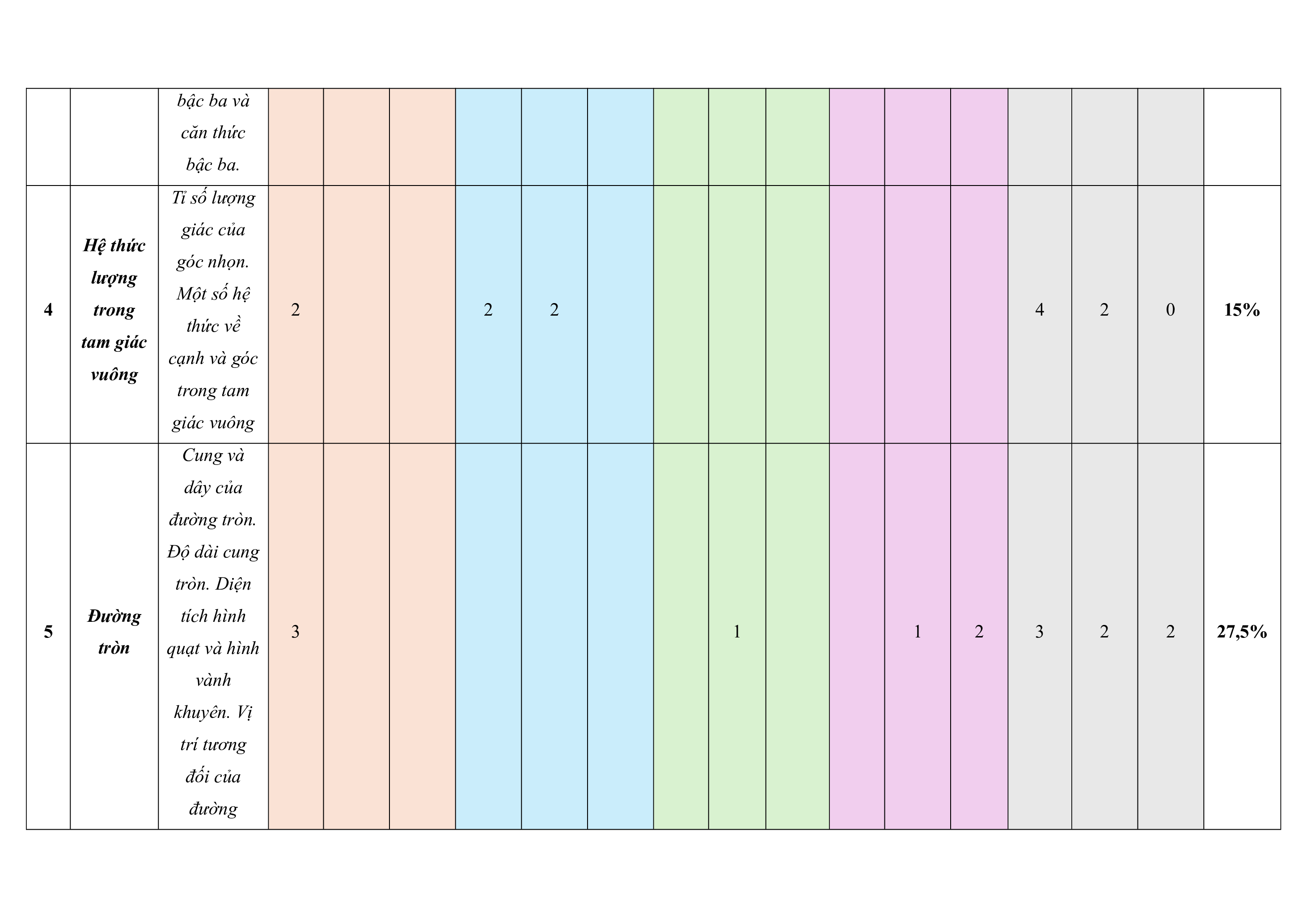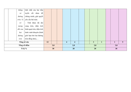 tam giac canh và goc vuông trong tam giác vuông Cung và dây cua đường tròn. Đô dài cung tròn. Diện Đường tích hình 5 3 1 1 2 3 2 2 27,5% tròn quat và hình vành khuyên. Vị trí tương đôi cua đường thăng và đường tròn. Vị trí tương đôi cua hai đường tròn. Tổng số câu 12 4 4 3 1 1 5 16 8 6 30 Tổng số điểm 3,0 2,0 2,0 3,0 4,0 3,0 3,0 10 Tỉ lệ % 30% 20% 20% 30% 40% 30% 30% 100% Lưu ý: