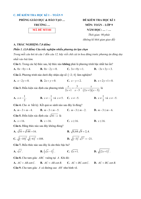 ĐỀ KIỂM TRA HỌC KÌ 1 – BỘ SÁCH: KẾT NỐI TRI THỨC VƠI CUỘC SỐNG MÔN: TOÁN – LƠP 9 ĐỀ SỐ 01