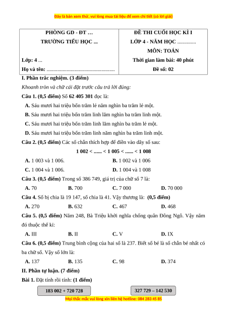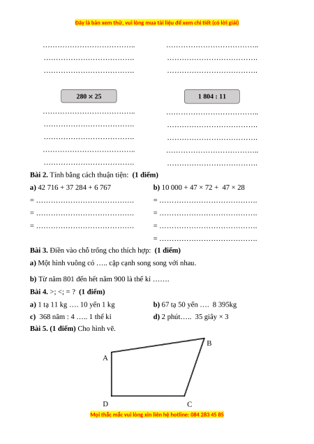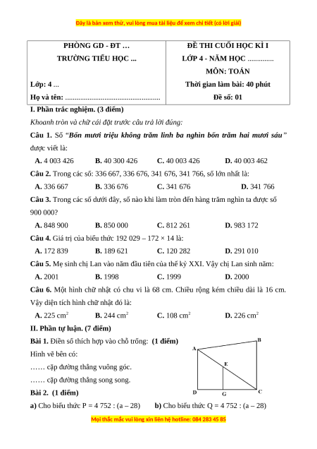 LỚP 4 - NĂM HỌC .............. MÔN: TOÁN Lớp: 4 ...