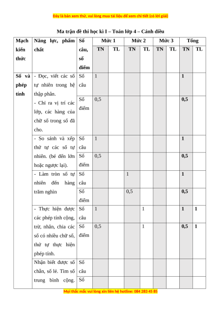 Ma trận đề thi học kì I – Toán lớp 4 – Cánh diều