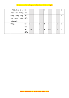 - Nhận biết và vẽ Số 1 1 được: Hai đường câu thẳng song song, Số 1 1 hai đường thẳng điểm vuông góc Tổng Số 3 2 5 1 1 6 6 câu Số 1,5 1 6 0,5 1 3 7 điểm