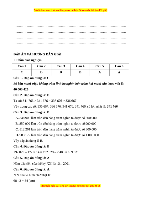 Câu 1. Số “Bốn mươi triệu không trăm linh ba nghìn bốn trăm hai mươi sáu” được viết là: A. 4 003 426 B. 40 300 426 C. 40 003 426 D. 40 003 462