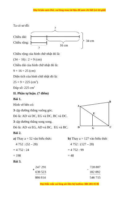 Câu 6. Một hình chữ nhật có chu vi là 68 cm. Chiều rộng kém chiều dài là 16 cm.